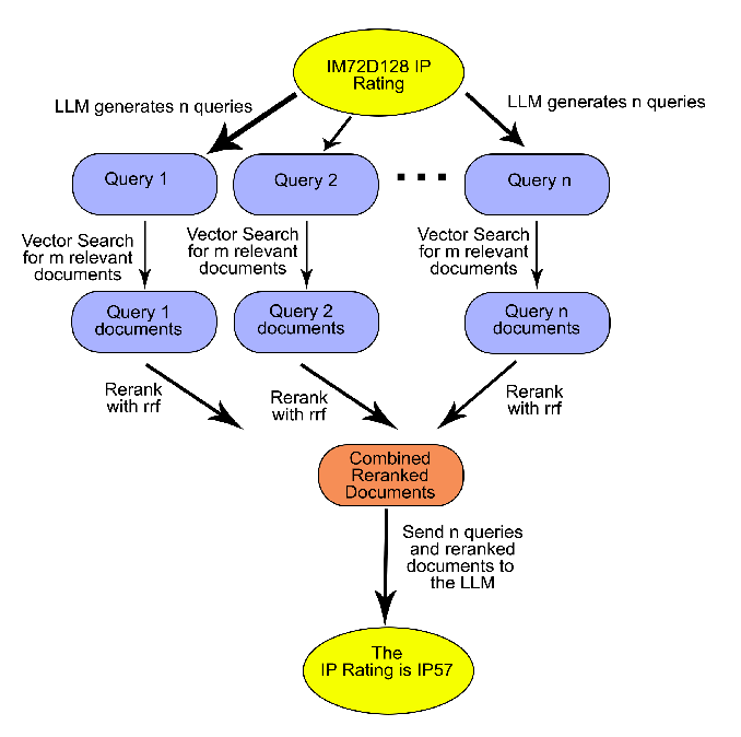 2. 생성된 쿼리를 사용하여 관련 문서를 벡터 검색을 통해 찾음검색된 문서들을 상호 점수(rrf scores)를 사용하여 재순위(상호 점수는 문서의 현재 순위와 일정한 스무딩 팩터(k)를 사용하여 계산)